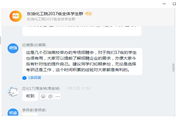 注重就业意识向下延伸,借学业预警之际强化专业指导和就业指导。就业工作从表面上来看,是考验大四年级员工的成绩和综合素质,实际上,是对大学四年人才培养质量的全面检验。学工组的专、兼职辅导员借助学业预警谈话之际,与大一、大二、大三的部分同学谈心,在聊学习、聊成绩的同时,进一步让员工明确通过外语四六级的重要性,提高同学们对专业的重视和就业意识。大三员工也参与观看了毕业年级就业大会的直播,提前感受就业、参与就业,树立危机意识、激发拼搏精神。目前,2017级的同学已经参与了石油英才荟--全国石油高校网络联合招聘会的相关活动,正在准备观摩“东北振兴、‘职'等你来”2020届东北七校空中双选会,为下学期即将来临的招聘季做好热身。