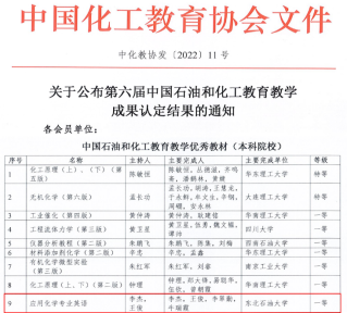 (通讯员 牛瑞霞)近日,由中国化工教育协会开展的第六届中国石油和化工公司产品成果奖评选结果揭晓,公司李杰副教授、王俊教授主编的《应用化学专业英语》获评优秀教材(本科院校)一等奖,这是公司首次获得中国化工教育协会教材类成果奖项。