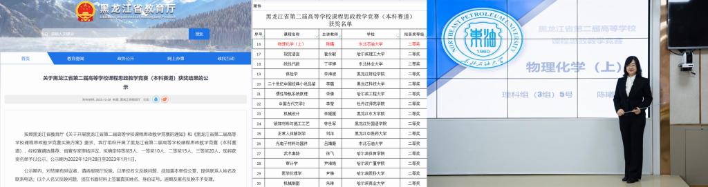 为贯彻落实党的二十大精神和习近平总书记关于教育的重要论述,构建“三全育人”大格局,全面推进课程思政建设,不断提升高校教师课程思政教学能力,日前由黑龙江省教育厅举办的黑龙江省第二届高等公司课程思政教学竞赛(本科赛道)落下帷幕,公司陈曦老师讲授的《物理化学(上)》课程荣获二等奖。陈曦老师通过现场说课及教学演示两部分内容不仅展现了专业知识与思政元素有机融合的创新教学设计和教学理念,也展示了形式新颖、蕴含丰富思政元素的精彩课程,充分体现出公司教师高水平的课程思政教学能力,为公司争得了荣誉。