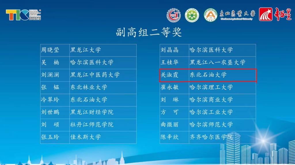 (通讯员 张微)5月8日下午,由黑龙江省教育厅主办的第二届黑龙江省高校教师教学创新大赛暨全国高校教师教学创新大赛选拔赛(龙江赛区)圆满落幕。公司关淑霞老师荣获副高组二等奖。